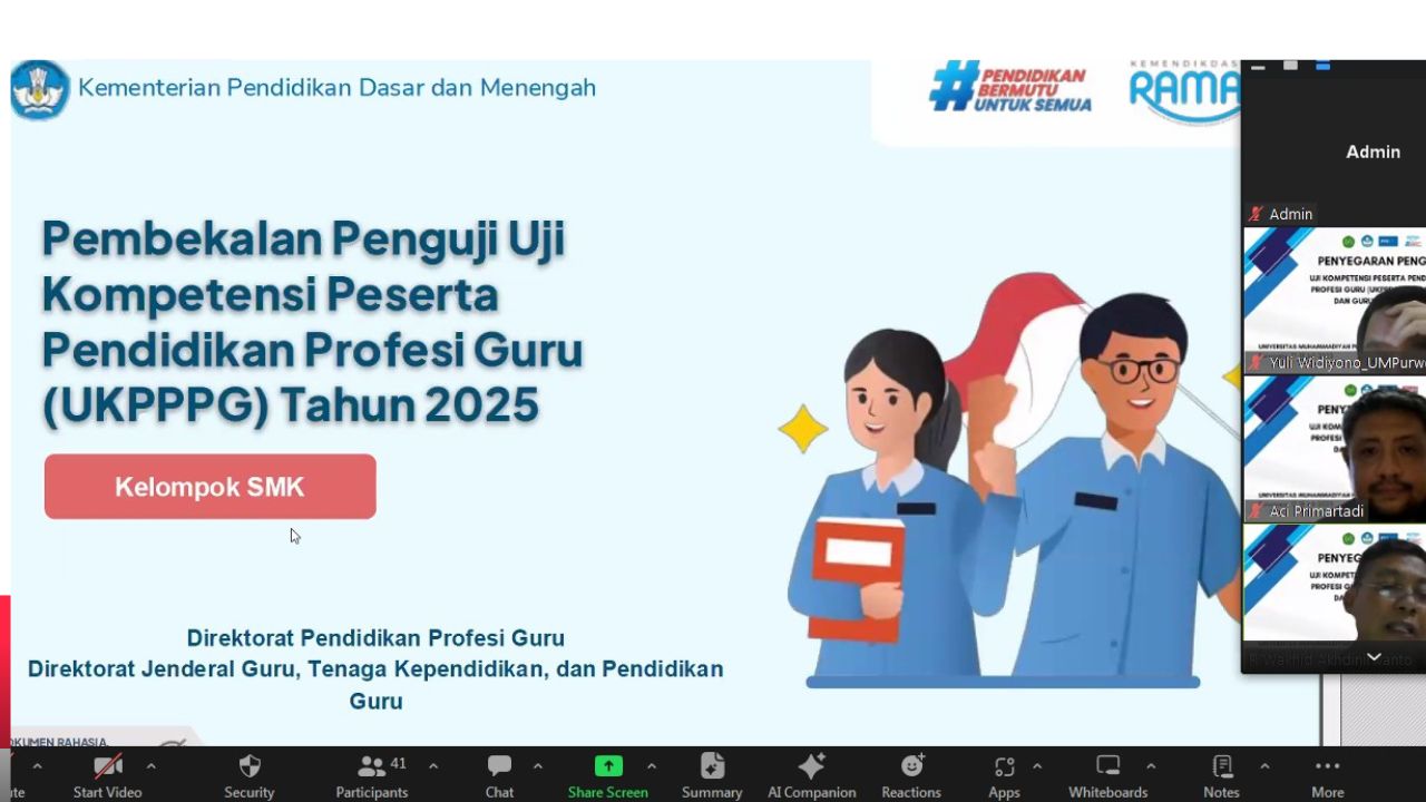 Purworejo – Program Studi Pendidikan Profesi Guru (PPG) Universitas Muhammadiyah Purworejo kembali menggelar kegiatan Penyegaran Penguji pada Kamis, 17 Juli 2025. Kegiatan ini dilaksanakan secara daring melalui Zoom Meeting dan diikuti oleh para penguji serta pengelola PPG sebagai persiapan pelaksanaan uji kinerja dan penilaian mahasiswa pada Semester II CAGUR.